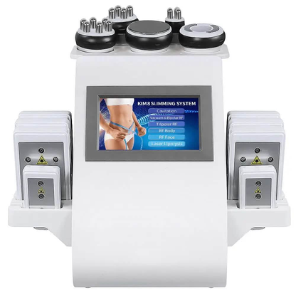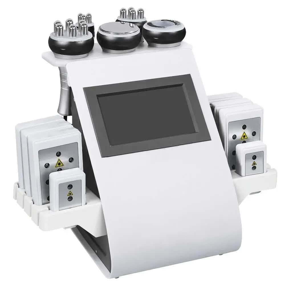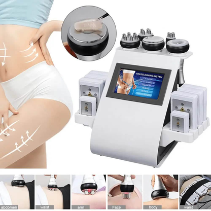 This machine offers 6-in-1 functionality, including 40K ultrasonic cavitation, RF for face and body, vacuum and bipolar RF, tripolar RF, and laser lipolysis pads.